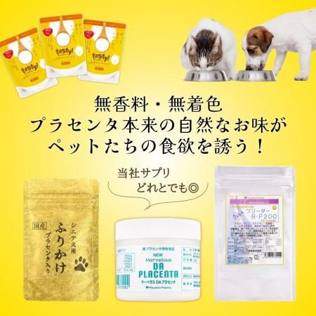また、飼い主様はもとより、ご高齢者様、疲れやすい方、肌美容をお望みの方にも、自然の力で体調を整え健やかにお過ごし頂きたいと願いプラセンタ・サプリメントを製造販売しております。